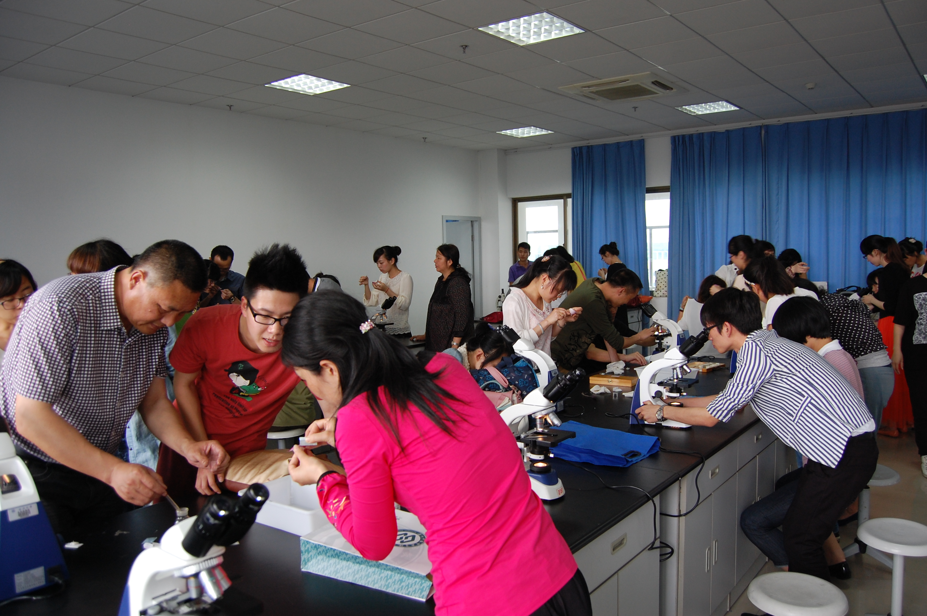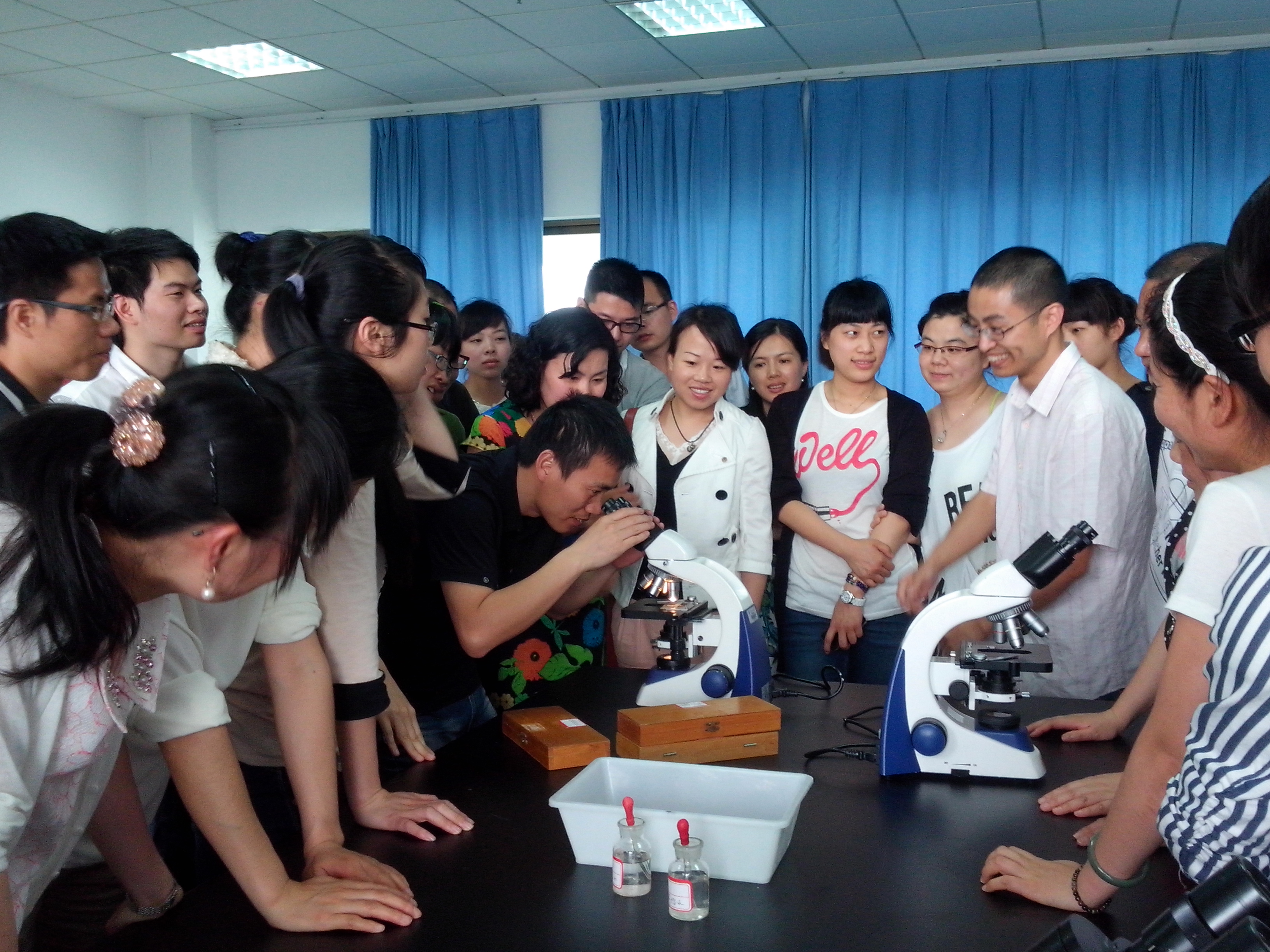 活动伊始,由金建钰老师做《显微镜下的生命世界》专题讲座。之后,各位科学教师怀揣着对微观世界的兴趣,从熟练使用光学显微镜入手,先后制作洋葱、鸭跖草表皮临时装片和泥蚶血涂片,并运用数码显微镜对血涂片进行观察并摄影记录。在实验过程中,各位骨干教师好学不倦,不断就一个个小疑问和小教科学班的同学展开激烈的探讨。同时,在实验操作要求方面的严谨,也反映了科学教育工作者的特色。当一张张血涂片制作成功,学员们欢呼雀跃,高兴地要和自己的成果合影留念。