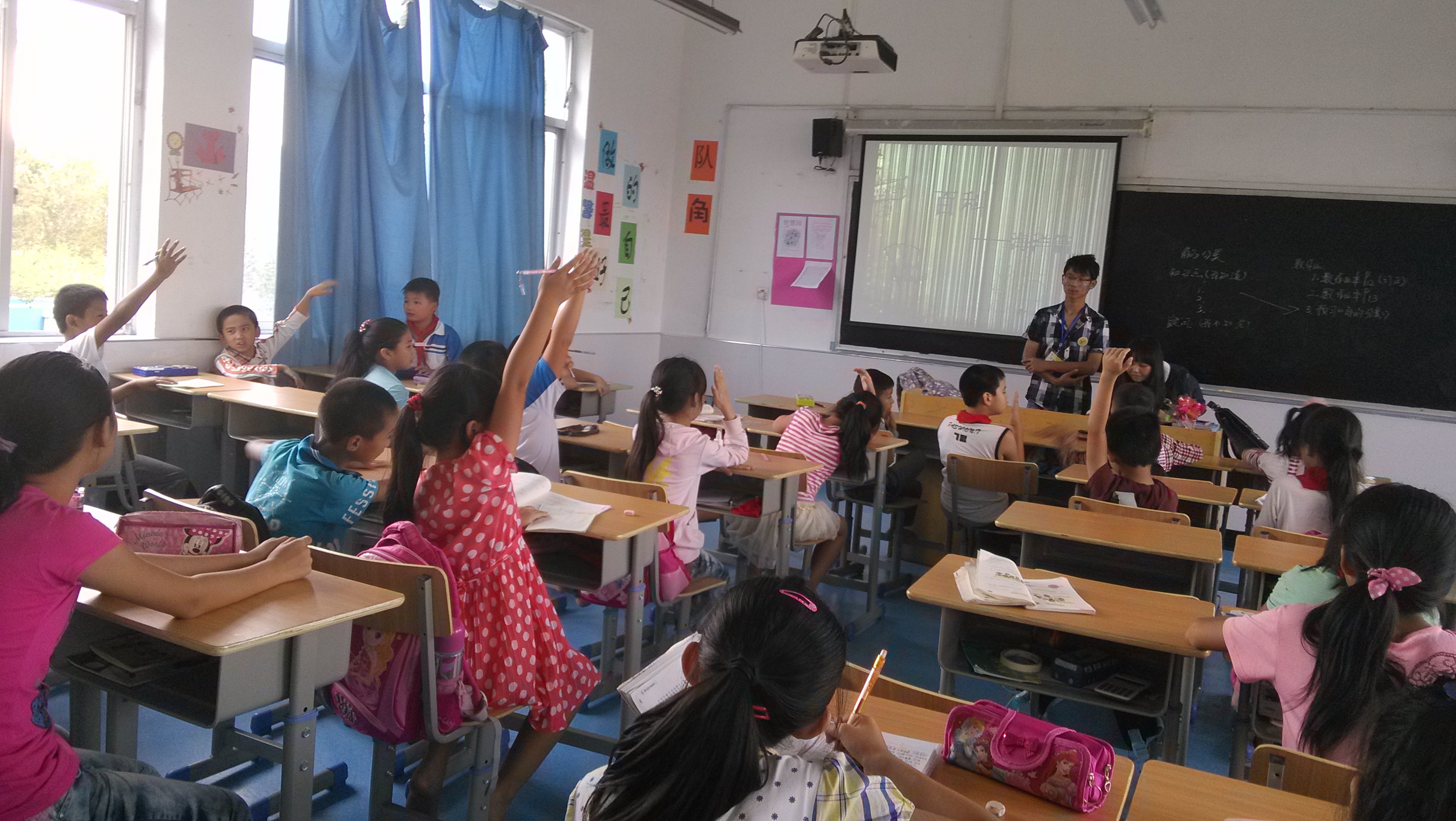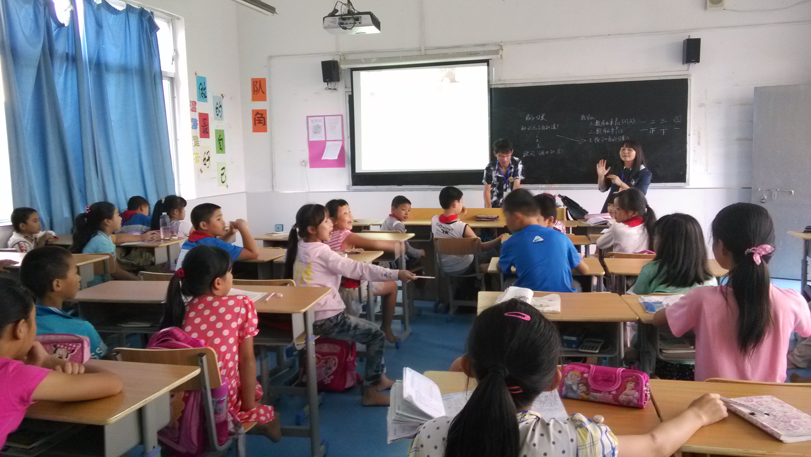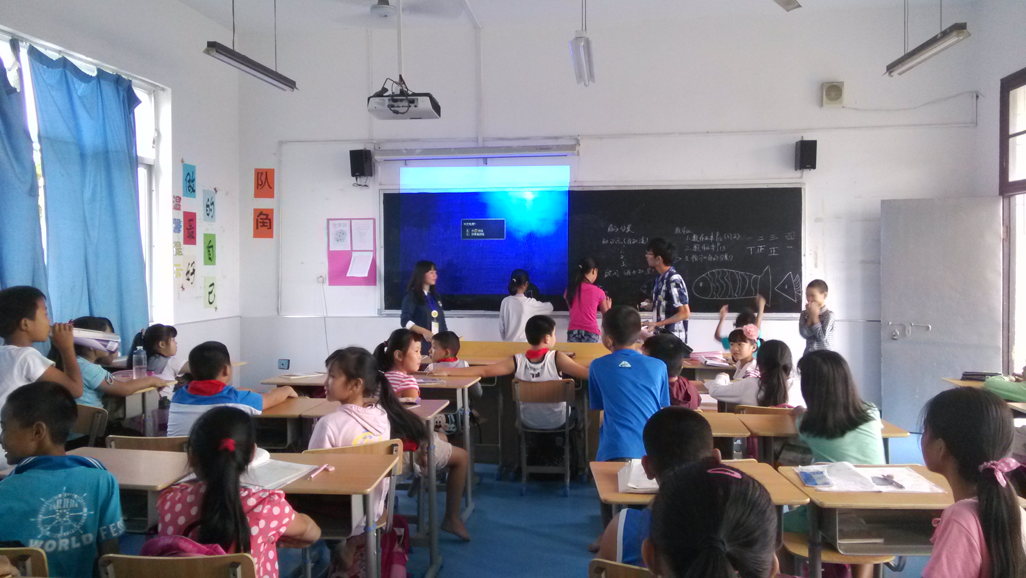 在活动的教室,光脚进入的规定让我们先觉惊讶,而后又被这一群可爱小朋友的认真、对干净的要求给打动了。投在屏幕上的PPT以四大洋、中国的所在位置为开篇,让爱国精神在小朋友们初期萌芽。“让我们来猜猜这些鱼的名字”把气氛推向了高潮。面对各种奇形怪状的海洋深底海鱼,小朋友的热情抢答与正确率也让我们小小教师吃了一惊(佩服小朋友们的智慧)。伴着四个小组代表在黑板上画他们心目中的鱼,不知不觉的活动已接近尾声。
