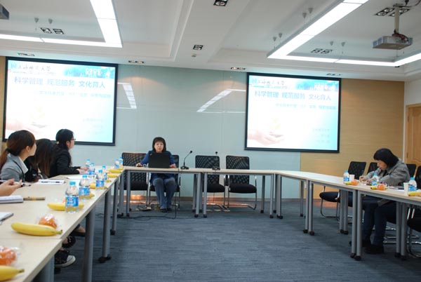 4月13日上午,考察学习团到达上海师范大学。上师大学工部副部长张益、教育学院副书记谢青、后勤集团副总经理张红英、学工部思想政治教育办公室主任张兰及团委书记黄琼翠对我院师生一行表示了热烈的欢迎。随后,我院嵇小怡副书记将学校、太阳概况向上师大的领导和老师们作了简单介绍,并表示要向上师大好好“取经”。张兰主任首先介绍了本校学生管理及学生公寓工作的情况,并向我们着重讲述了“五进”学生宿舍的工作思路,即思想教育进园区、党团教育进园区、文化和学术活动进园区、就业指导进园区、心理健康教育进园区。希望通过“五进”宿舍活动,可以达成学生党员受教育,全体学生得启迪,综合素质上水平,全面发展见成效的局面。在后勤管理方面,张红英副总从“六T”简介、“六T”历程、“六T”建设、“六T”成效四个方面对“六T”实务工作作了详尽的介绍。秉着“设身处地为学生着想,真心实意为学生服务”的工作理念,后勤集团通过“六T”工作的开展,真正做到了“常规工作抓落实,重点工作抓推进,特色工作抓拓展”。最后,谢青书记从“大学工”工作理念、辅导员队伍建设及师范生专业培养三方面介绍了上海师范大学教育学院的学生工作。