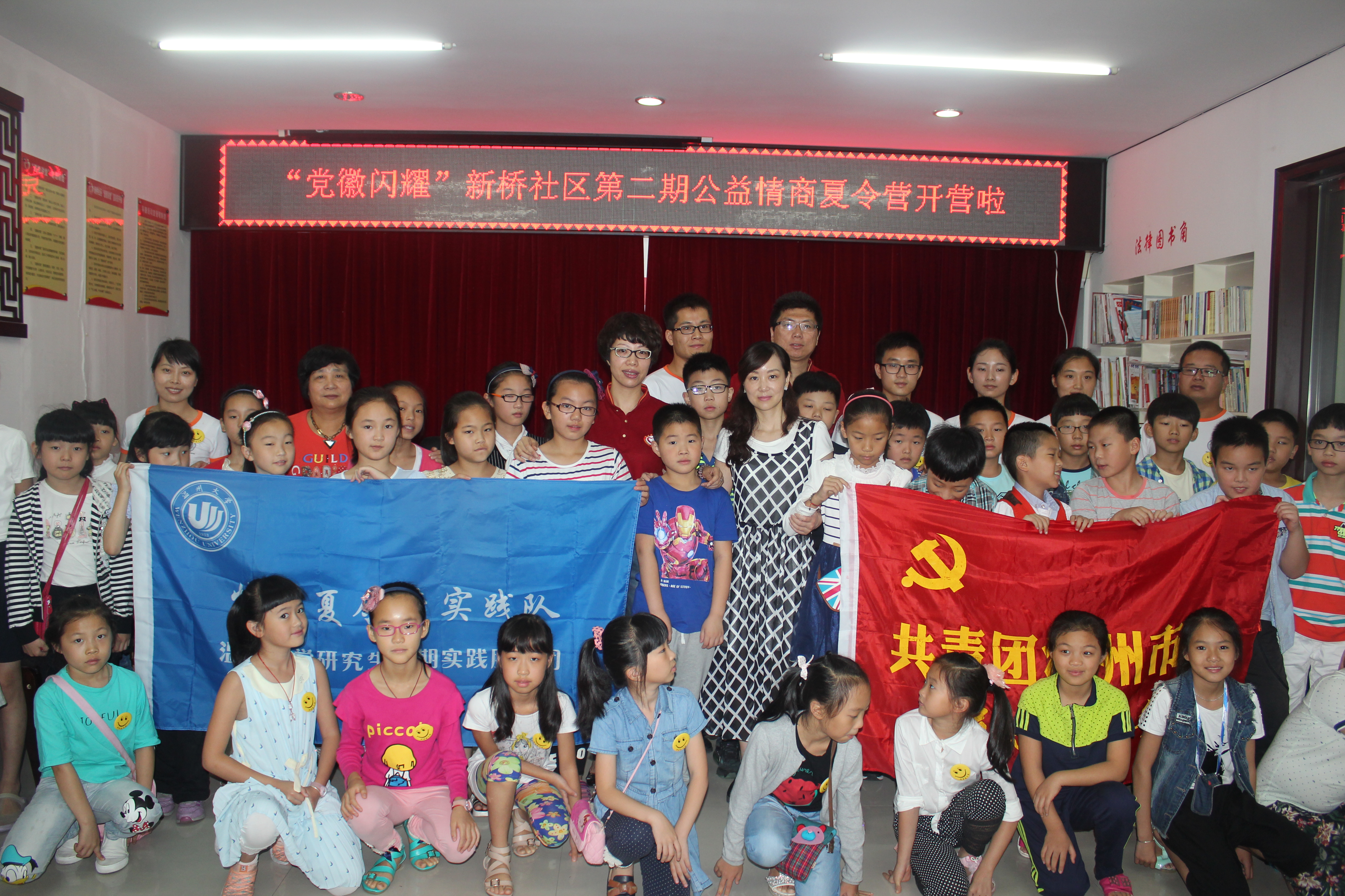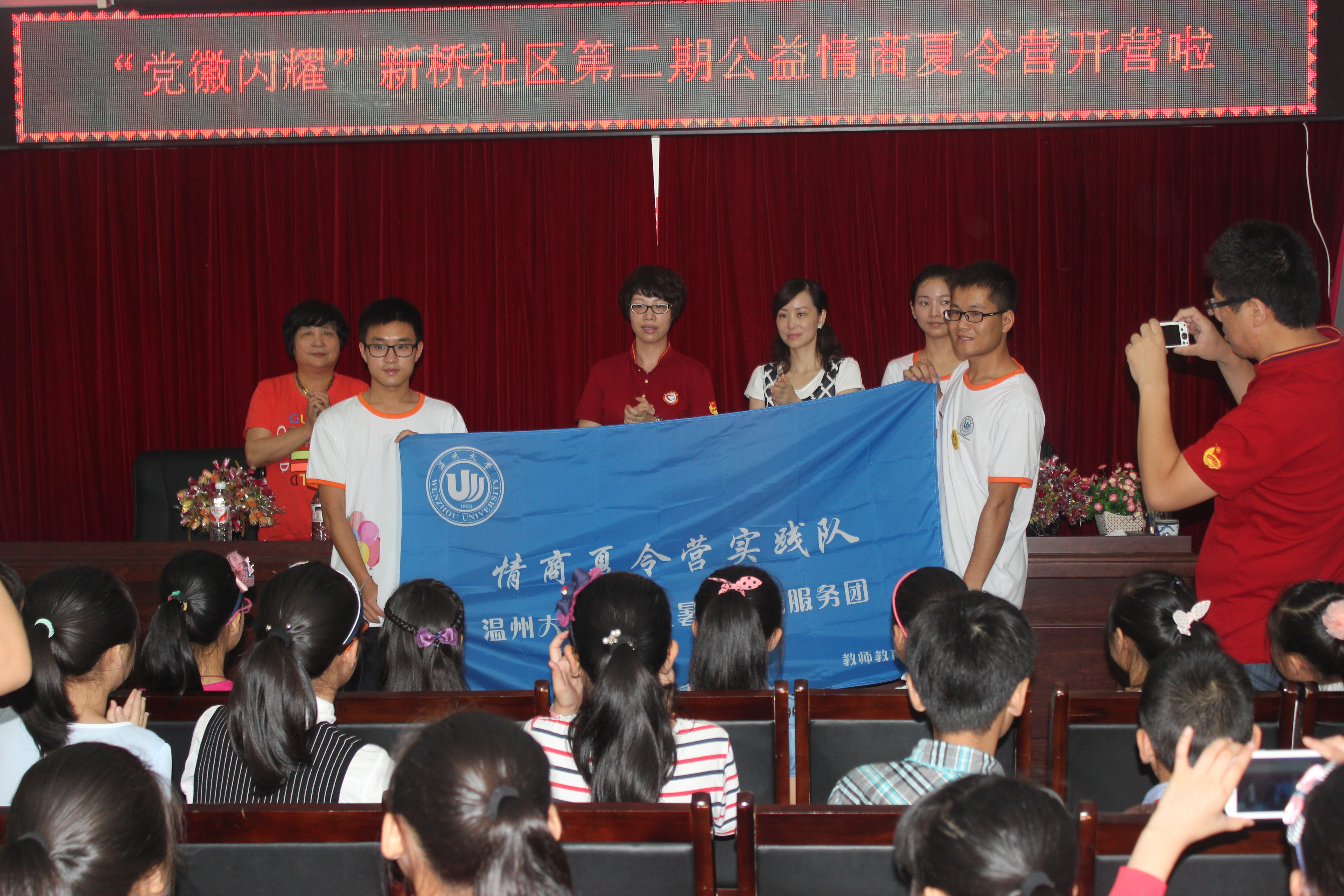 旋律飞扬,喝彩连连。2014年7月7日上午,在温州团市委的支持和指导下,太阳成集团tyc234cc研究生实践队牵手新桥社区组织举办的第二期公益情商夏令营开营啦!团市委机关党委副书记鲍雅梦、太阳成集团tyc234cc党总支副书记杨丽君、新桥社区书记许信月、太阳成集团tyc234cc情商夏令营实践队全体队员,以及新桥社区46个小朋友营员参加了开营仪式。