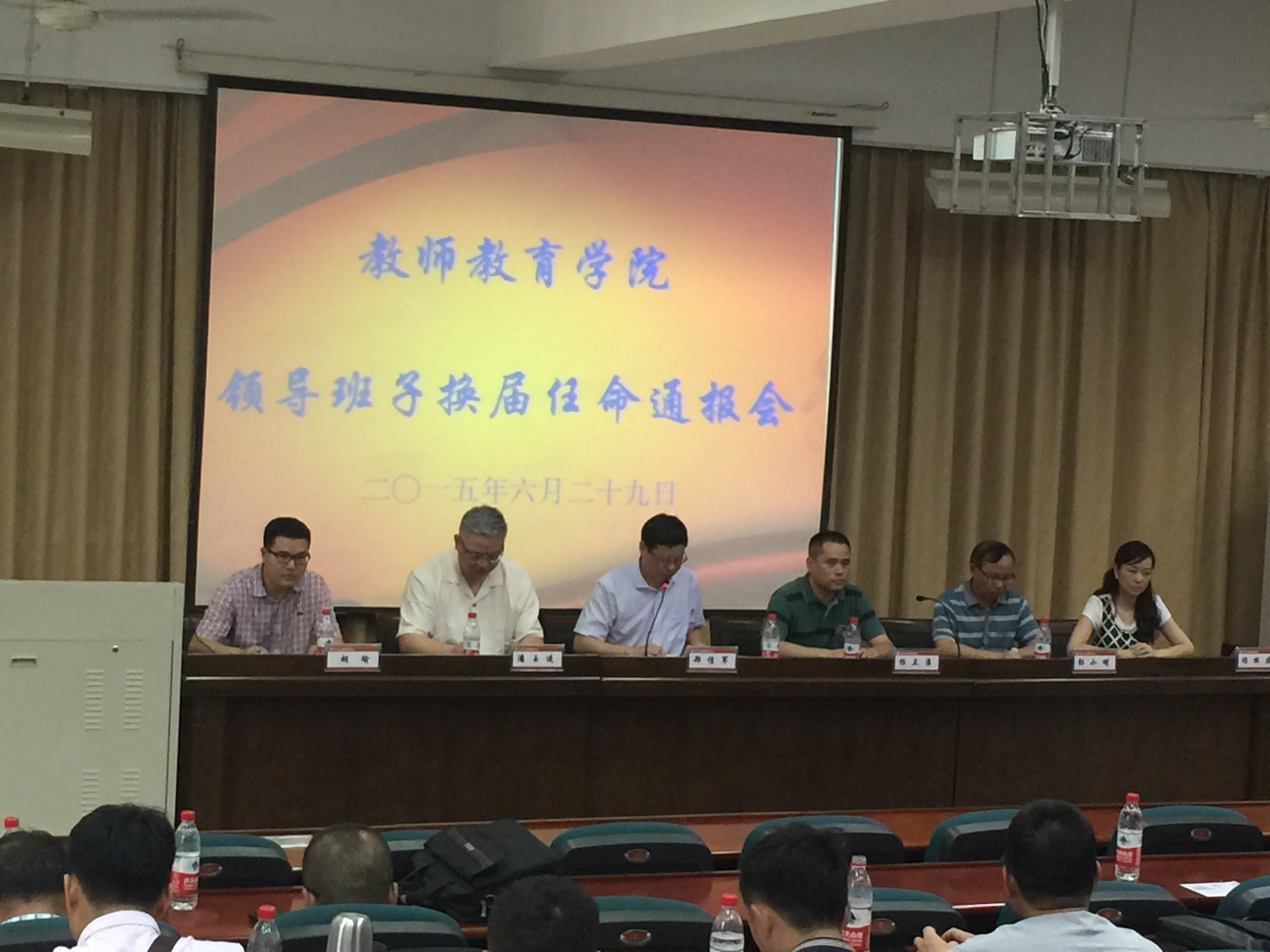 会议分两项议程。第一项议程是通报领导班子及科级干部的换届任命工作。郑信军院长向全院教师隆重介绍了新任我院党总支书记杨立淮同志、党总支副书记杨丽君同志以及学生科副科长林萍同志,并宣读了学院领导班子新的分工。杨立淮书记、杨丽君副书记作了表态发言。