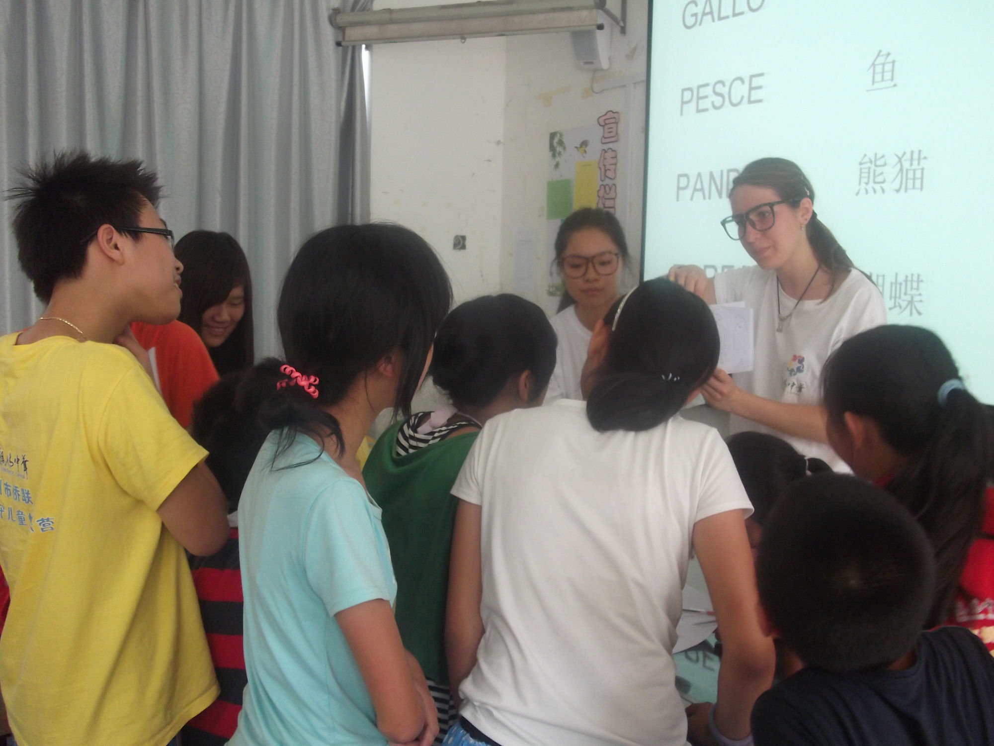 随着上课铃声的响起,同学们一起用意大利语热情地欢迎两位外教,老师对同学们能够如此快速地掌握意大利语给予了高度表扬。课堂上,外教先用短短的几分钟时间帮助同学们复习之前学过的内容:十以内的数字、如何询问他人的年龄和四种动物。看到同学们已经可以熟练地说出动物的名字,两位外教便趁热打铁,发下一张小纸,引导同学们各自动手在纸上画出小动物的形象。面对这种表现自己的机会,同学们充分地发挥自己的想象,各种栩栩如生的动物形象渐渐地呈现在一张张白纸上。接着,老师举着全班同学的“佳作”,让同学们用意大利语说出动物的名字,加强学生们对知识的掌握,并嘱咐学生在课后将作品贴在班级的后面,以达到将课堂所学与生活所需紧密结合的目的。然后,同学们又学习了龙、鸟、狗等六种动物。这节课热闹非常,终于,课堂在两位意大利外教的积极引导下结束了,但是学生们却还热情地邀请老师多上几分钟,同学们对意大利语的兴趣可见一斑。