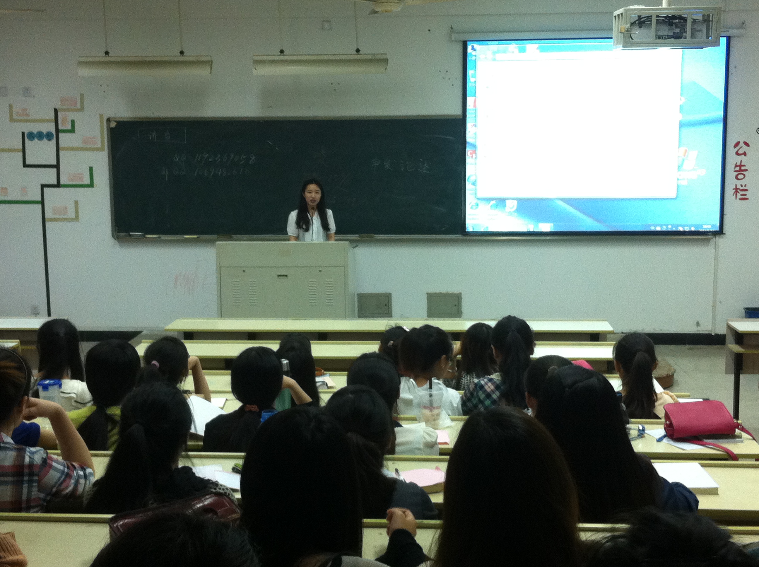在交流会的最后,获得省第六届师范技能比赛一等奖的王怡璇学姐向同学们介绍了比赛的有关情况,并针对即将到来的师范技能考核向同学们提出了宝贵的建议。王学姐从教学设计、课件制作、模拟上课、说课等方面做了系统详细的介绍,让同学们耳目一新,对如何备课有了充分的了解。