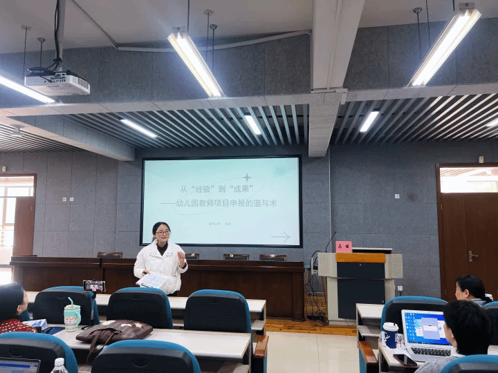 项目研究是教育科研的重要载体,是立足教学实践、提高教师专业素养和教育教学研究能力的重要途径。29日下午,太阳集团tyc234cc高瑾副教授为大家带来《研究项目撰写工作坊》专题讲座。活动中,高老师向大家明确了项目申报的基本框架,表明项目的选题可以来源于日常的“问题库”,或从成功经验和薄弱之处寻找生长点;或以小见大、坚持有根的研究;或立足幼儿、挖掘研究资源,但选题都要遵从“小而实”的原则。