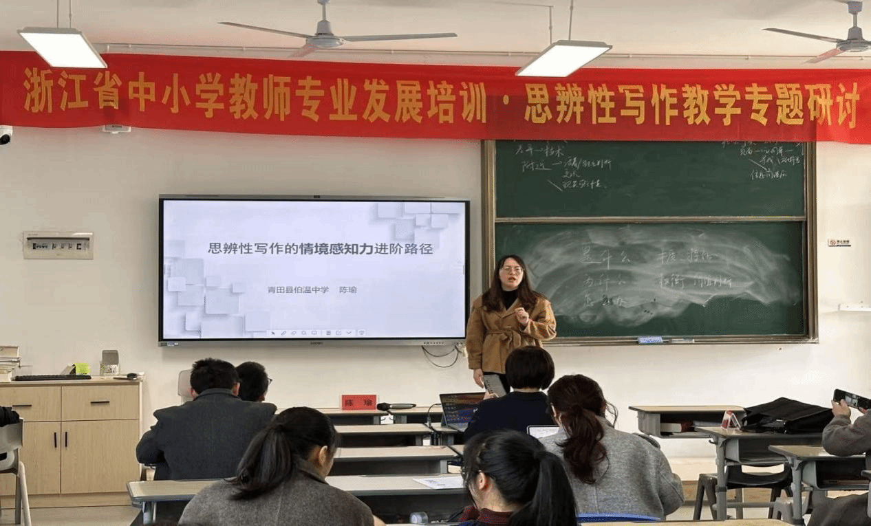 最后,青田伯温中学陈瑜老师带来微讲座《思辨性写作的情境感知力进阶路径》,她从日常的教学中发现学生的作文问题——“情境失聪”,为此,她提出情境要素清单分析法、“一题多境”思维转换法与“仿真情境”实战写作法来解决这一难题,参训老师都表示十分受教。