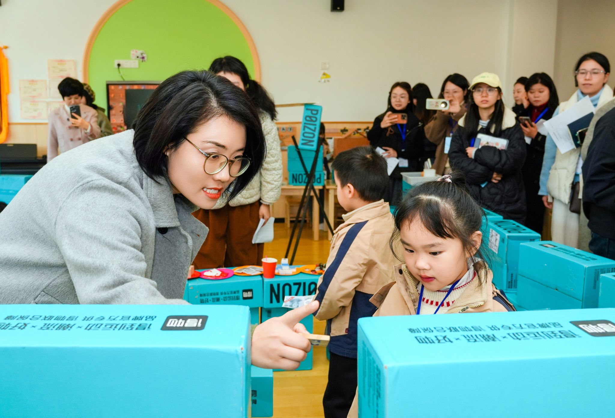 随后学员老师们进各班观摩数学游戏。该园教师们充分挖掘本土特色与幼儿生活经验,设计了主题数学游戏区,将动车、长城、儿童酒店、江心屿等趣味元素与点数、配对、排序等数学核心经验相结合,打造了一系列充满童趣与智慧的游戏场景,让幼儿在沉浸式体验中感知数学的乐趣。