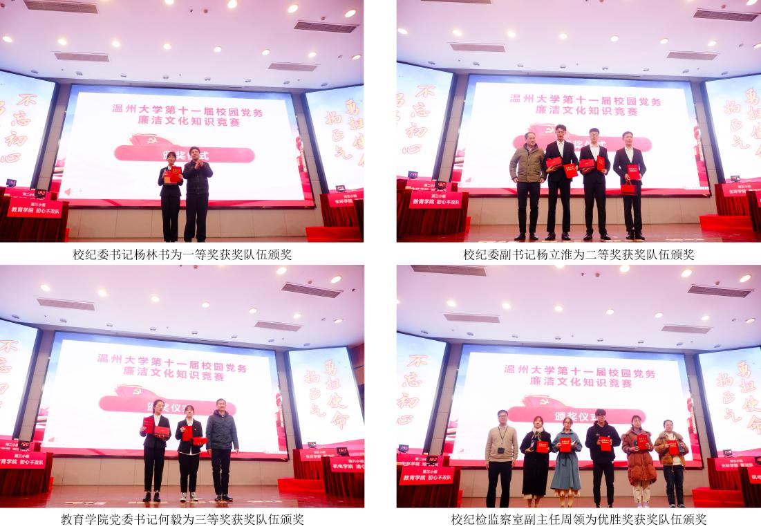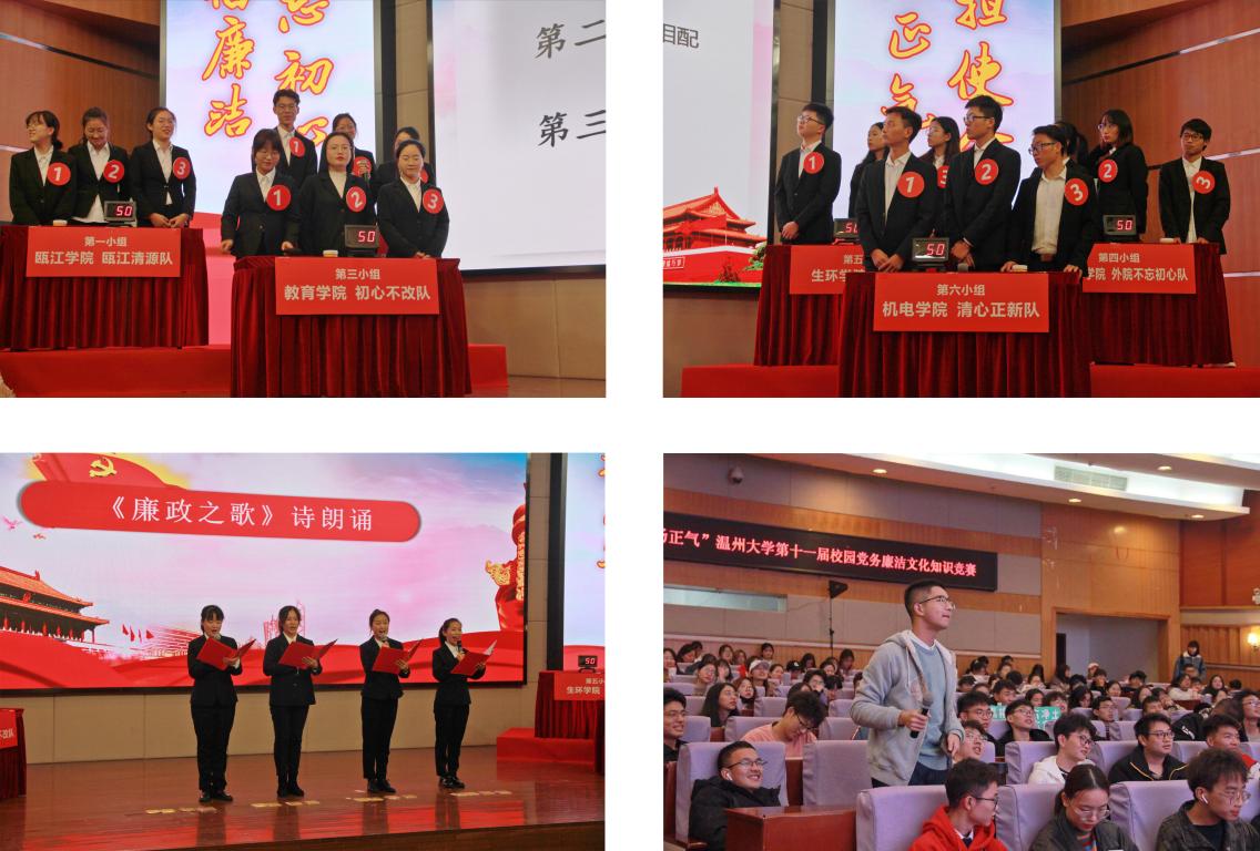 本次廉洁文化知识竞赛分线上答题和线下答题,参与学生超3000人,线下比赛环节分初赛和决赛,共有10个学院12个代表队报名参加,经过前期的层层选拔共有6支代表队进入决赛。决赛以《廉政之歌》诗朗诵开篇,共设必答题、抢答题、危险题、幸运题四个环节,并在其中穿插观众答题互动。竞赛充分展示了各队选手对理论知识掌握的熟练度,比赛异彩纷呈,经过紧张激烈的角逐,最终教育学院初心不改队荣获一等奖,机电学院清心正新队、生环学院对对对队、生环学院素洁队获得二等奖,瓯江学院瓯江清源队、外国语学院外院不忘初心队获得三等奖,体育学院三人行队、商学院廉洁队、计算机与人工智能学院计智如我队、人文学院知行合一队、电气与电子工程学院清廉队获得优胜奖。
